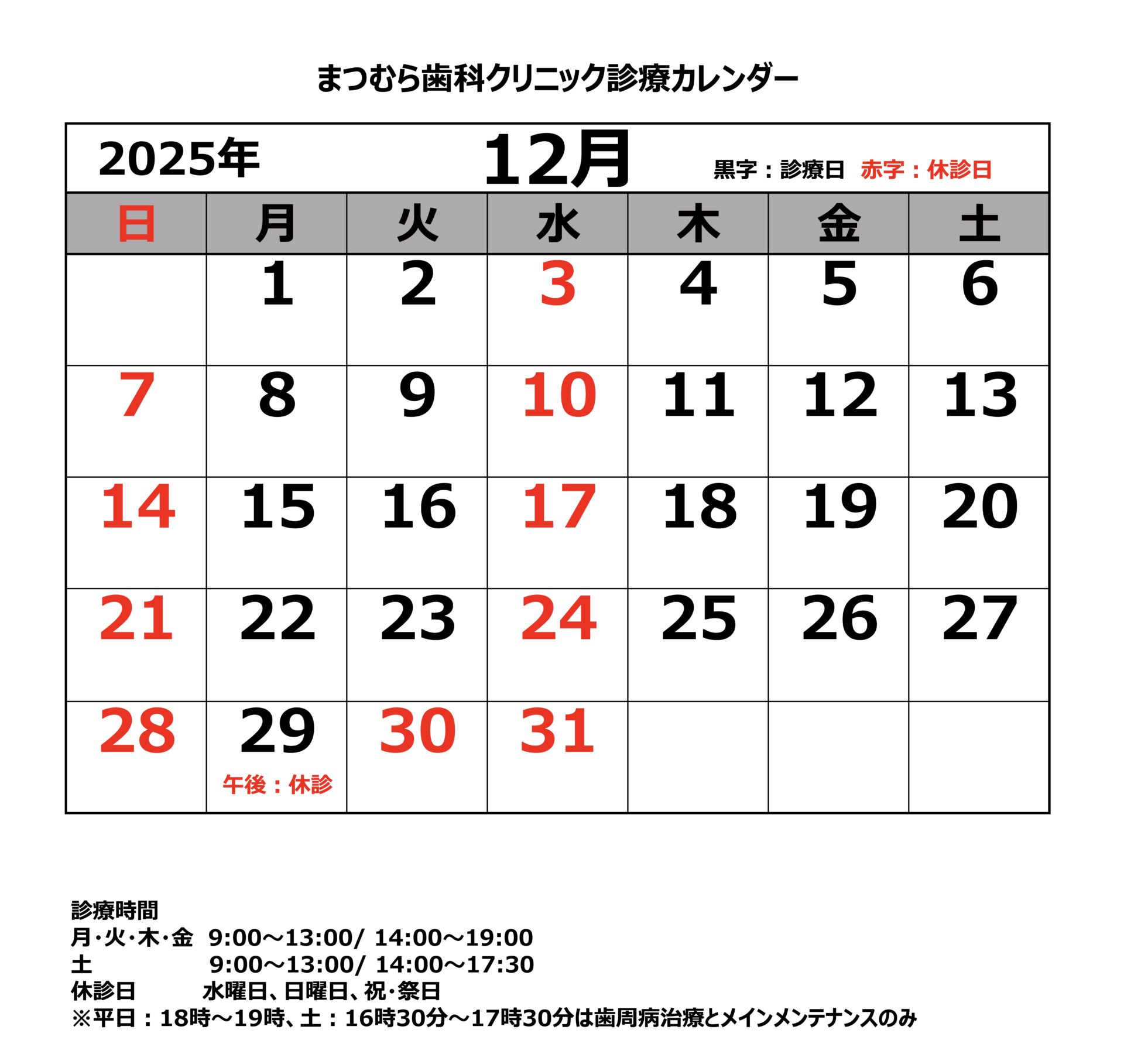 投稿公開日:2025年12月1日 2025年12月診療カレンダー いつもご来院いただきありがとうございます。 12月の診療カレンダーです。 29日は午後の診療を休診いたします。 <年末年始休業について> 12/29午後〜1/4まで休診いたします。 よろしくお願いします。 その他の記事を読む 前の投稿2025年11月診療カレンダー
